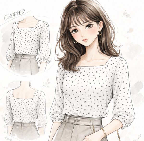 首元はスクエア寄りの開き。鎖骨が自然に見えるだけで、女性らしさがぐっと引き立ちます。